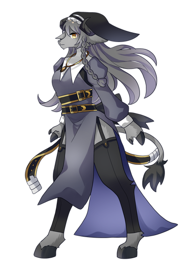基本的に黒山羊の獣人姿でいて、腰まである長髪で右サイドに編み込みがされている。